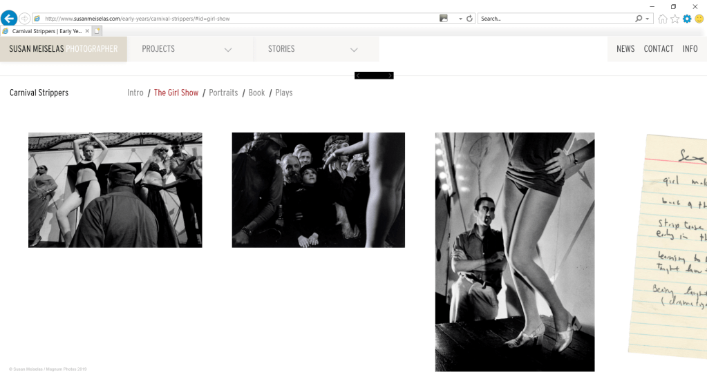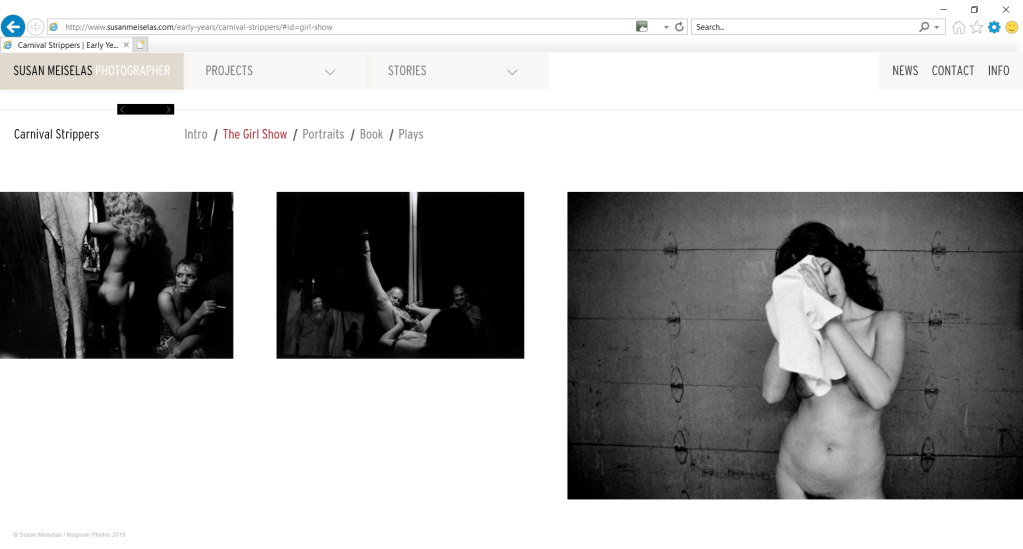 “Carnival Strippers is the first real body of work. So it’s not my very first pictures, but the first time I kind of discovered a way to be a photographer that felt right for me. I didn’t go out looking for carnival strippers or researching carnival strippers. I was travelling in summer actually following small circuses that were crossing America going out to the Midwest. When I came back through to New England and I was in Essex Junction and really everything unfolded. And then I spent two more summers really committing to following the path. (Meister, 2019) ”