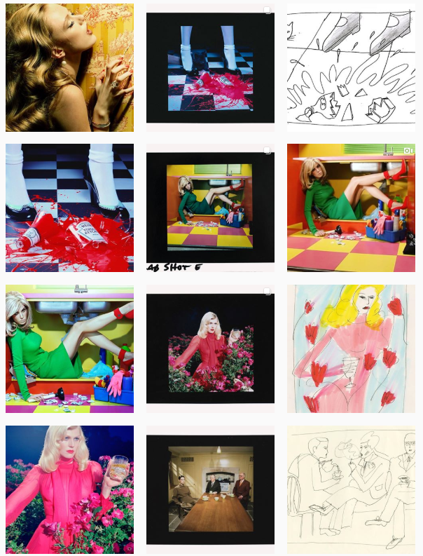 Fig 2: Various examples from Miles’s Instagram showing his use of illustration in his planning. From concept, to lab shot using Polaroid to final print (Aldridge, 2019)