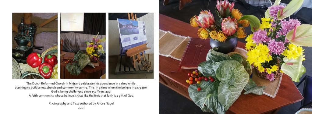 Looking at spread 7, the triptych is a series that bring the punctum (point) to the story. The text is intended for thinking people to ponder on. It starts with a grinder to make coffee. To me, it symbolised the grinding up of faith by a modernist toolIf the content offends, then I want to make another observation. I have experienced this twice now, where some student has strong opinions on a subject. They forget that the photographer may or may not present something he feels strongly about or as a practitioner, he has to undertake an assignment that opposes his/her belief system. David Goldblatt has shown, that as a practitioner, it is possible to detach yourself from making a judgement on ideologies, politics, world and views and present the story or subject in the most honest way possible. Sometimes, you should even try to understand your subjects to photograph them. You don’t have to agree with them. We as students need not be judgemental about the subject matter of our peers and see what we can learn from their work and other master photographers. If it is about the practice, and as this is a photography course, we should reciprocate with creative and positive criticism with a particular focus on photography. with the red papers indicating caution. The message on the screen is in Afrikaans that proclaim God as the creator contrasting with the impact of modernist thought introduced in the text below. And then, the architectural drawing is an indication of hope and continuity of the faith community in a future for their belief system. The closing photograph seems to reflect the opening photograph, but now the Vegetables and flowers seem to extend from the Bible.